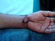 When I was still working a co-worker dropped a 1" EMT pipe from an 8' ladder unto the backside of my palm of my weak hand.  It cut 90% of the tendon that controls my pinkie.