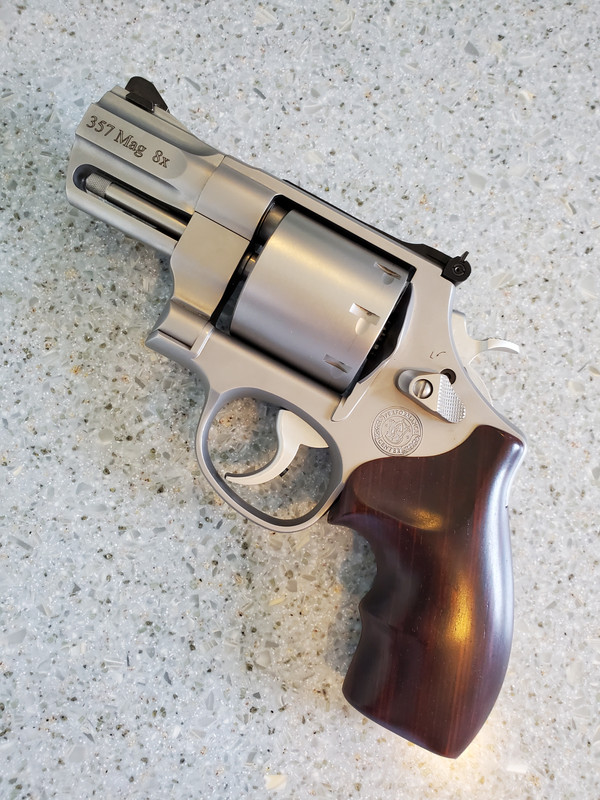 I sold a few things at the recent show so I decided to pick this up for myself:  NIB 627-5.  The factory grips suck so I put these on--Spegel Cocobolo boot grips.  Much better, but I gotta wait until next weekend to try it out.  Until then, lots of dry firing.